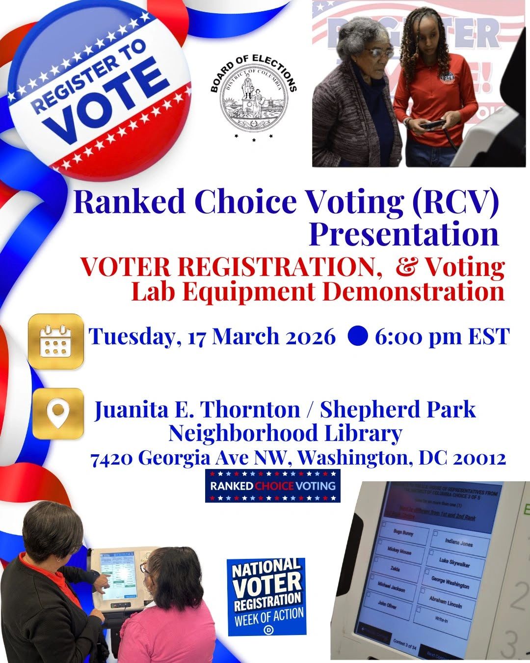 [DC BOE] **** TONIGHT **** Ranked Choice Voting (RCV) Presentation, VOTER REGISTRATION, & Voting Lab Equipment Demonstration -- Tuesday, 03/17/2026 @ 6pm est (Shepherd Library)